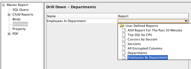 Step 4. Now edit the Departments report and choose the Drill Down item in the left options. Click "Add Report" This makes a new row in the table. The Name part is whatever name you like. The second will be a drop list of all reports in the tool. In this case, I scrolled down and choose my "Employees By Departments" report which is using the bind variable.