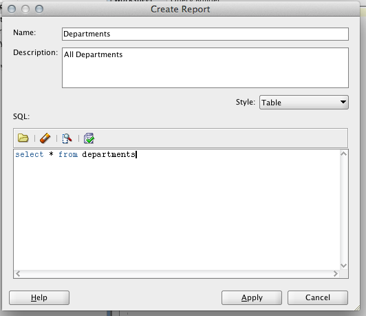 Step 2. Create a "Departments" report by naming it and entering the SQL. This dialog has drastically changed from what was in the previous versions. More on that later.