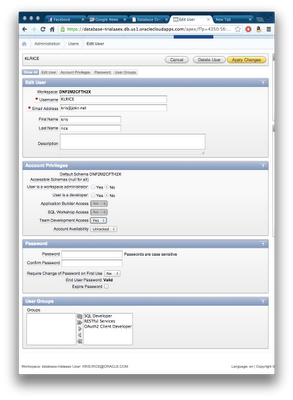 The key is that the User Groups listed at the bottom of the page have to all be granted. This is to allow SQL Developer an OAuth2 client to connect to the RESTful calls we have created. I'll get into that in another blog post.