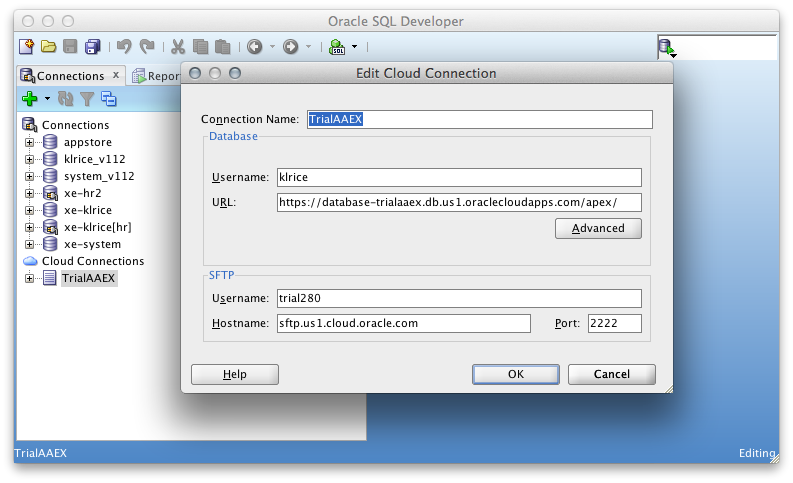 Now in SQL Developer, enter the username just created and the URL of the apex service into the URL field. Also the SFTP credential can be entered for doing data deployment ( also in another blog post coming soon ).