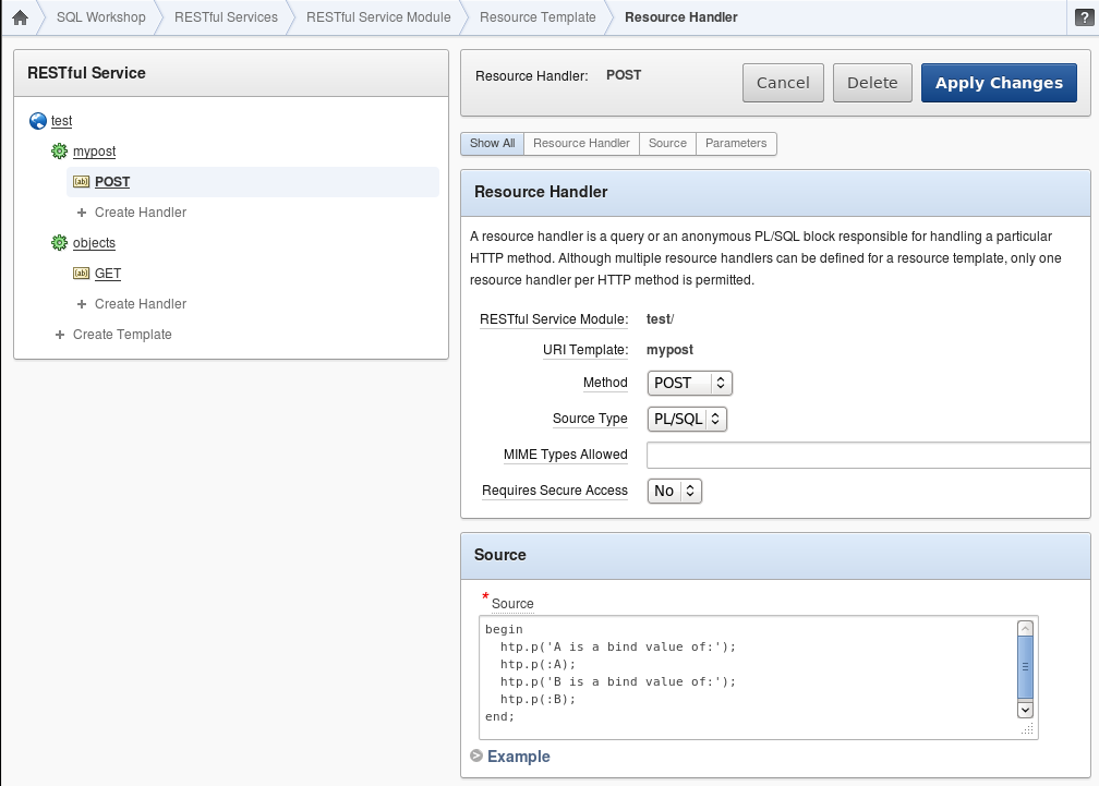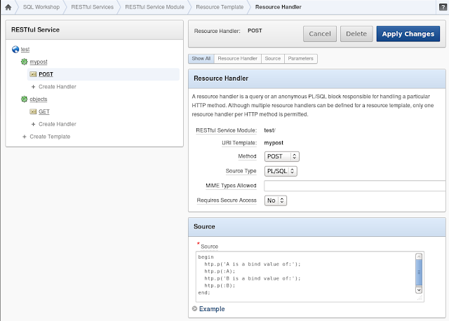 $ curl -X POST --data "A=hello&B=bye" https://apex.oraclecorp.com/pls/apex/raptor/test/mypost