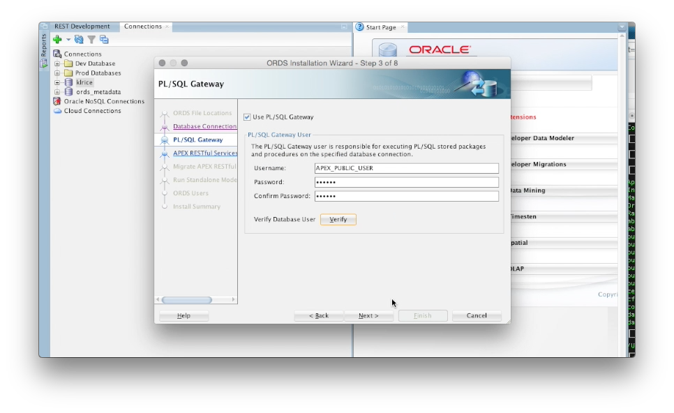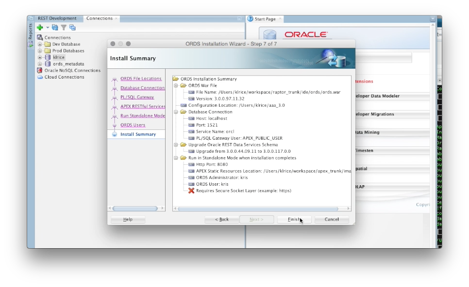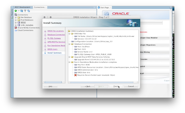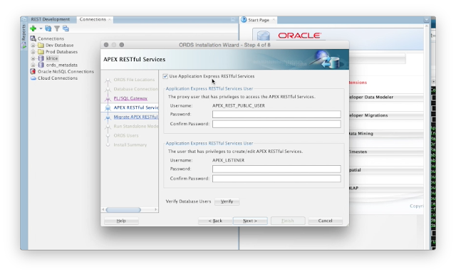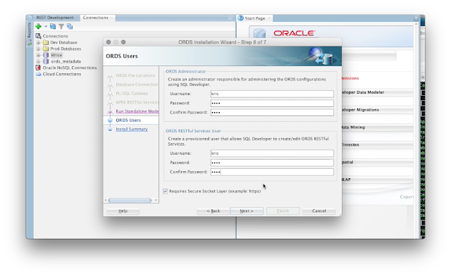 The next is the database credentials and connect strings. There is something new here in that the user is now ORDS_PUBLIC_USER. This is a change that has come in the decoupling from Application Express. Now ORDS is completely standalone and Apex is no longer required.