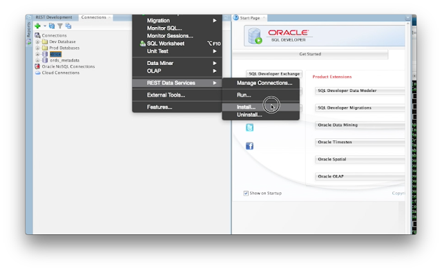 Taking the simple to install one step more, REST Data Services is now embedded into SQL Developer to be able to get up and running faster than ever. Under the Tools menu there is now options to Manage,Run,Install, and Uninstall ( although why would anyone? ).