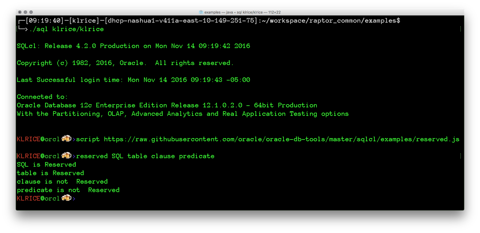 I saw Stephen's example of checking reserved words in the database from Vertan's day and figured I'd do the same in SQLcl.